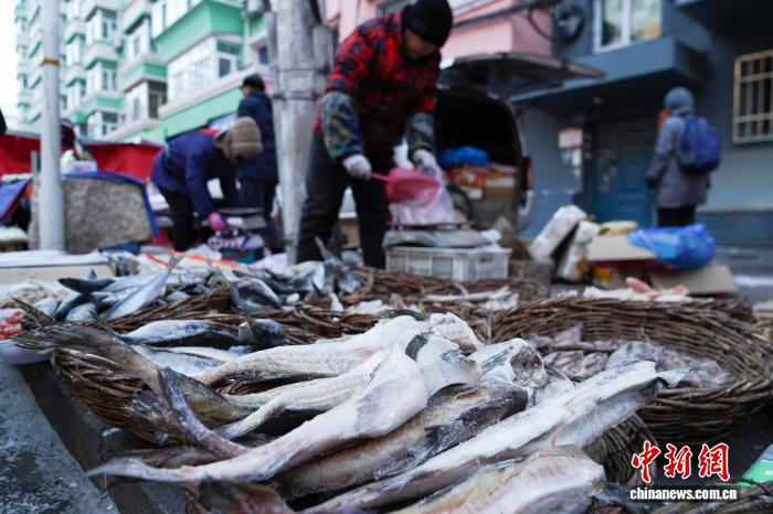 12月2日,黑龙江哈尔滨,各种冻鱼摆上街头售卖。当日,哈尔滨最高气温今冬首次降到-10℃以下,室外秒变“天然大冰箱”,商贩将冻鱼、冻鸡、冻柿子等摆上街头售卖。 中新社记者 赵宇航 摄