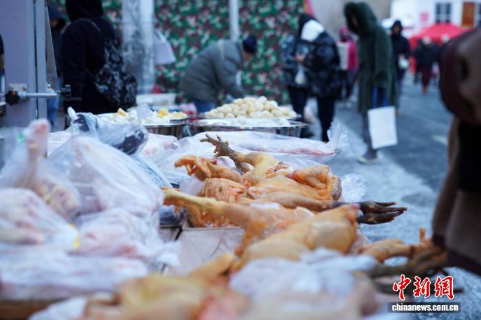 12月2日,黑龙江哈尔滨,冻鸡摆上街头售卖。当日,哈尔滨最高气温今冬首次降到-10℃以下,室外秒变“天然大冰箱”,商贩将冻鱼、冻鸡、冻柿子等摆上街头售卖。 中新社记者 赵宇航 摄