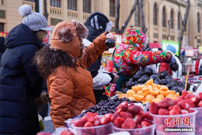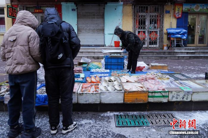 12月2日,黑龙江哈尔滨,市民选购冻货。当日,哈尔滨最高气温今冬首次降到-10℃以下,室外秒变“天然大冰箱”,商贩将冻鱼、冻鸡、冻柿子等摆上街头售卖。 中新社记者 赵宇航 摄
