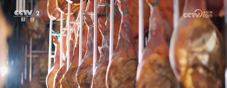如今,晒火腿也成为金华冬日的一道靓丽风景。在这家百年火腿厂,数万只形如琵琶的火腿整齐悬挂,工人们穿梭其间,为火腿进行翻晒、塑形,确保每只火腿都能均匀接受阳光的洗礼。