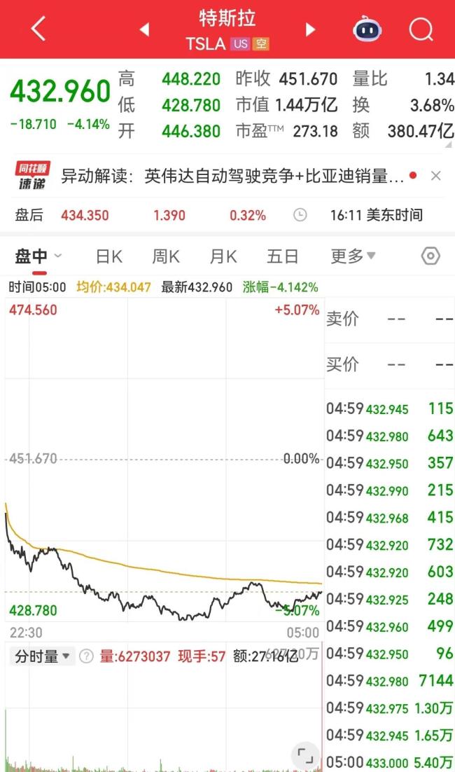 特斯拉股价下跌超过4%,报收于432.96美元,最新市值为1.44万亿美元,其市值一夜之间蒸发了662.30亿美元(约合人民币4346亿元)。