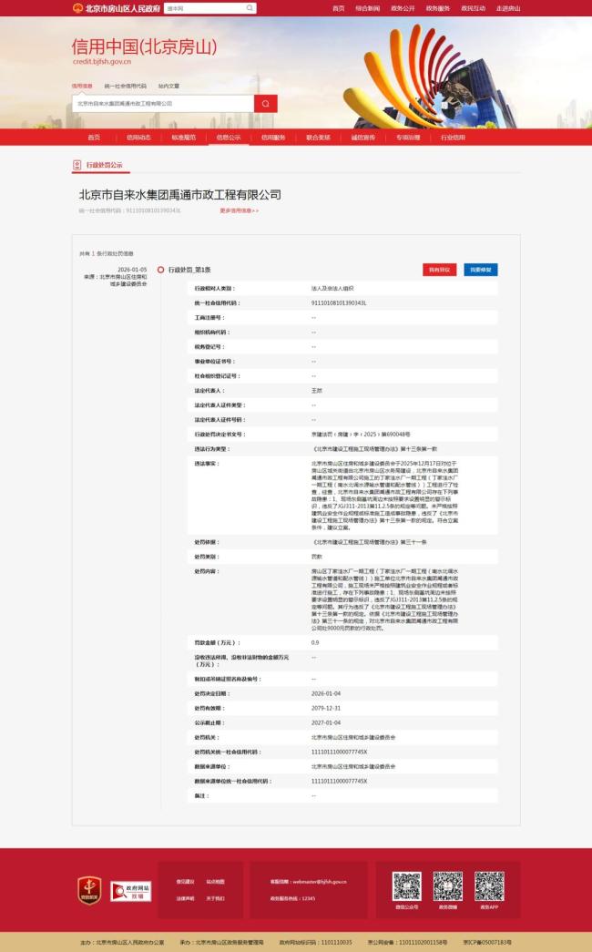 北京市自来水集团禹通市政工程有限公司因施工安全问题被罚款。据信用中国(北京房山)行政处罚栏公示,该公司于1月5日收到罚单。