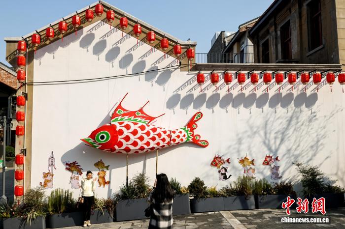 2月12日,湖北武汉,春节将至,武昌古城斗级营街区张灯结彩,处处洋溢着喜庆祥和的节日氛围。街区精心打造“抬头见黄鹤楼”的特色打卡场景,还可与武汉长江大桥同框,吸引大批市民游客前来打卡游玩。图为游客在武昌斗级营街区游玩与鱼灯合影。中新社记者 张畅 摄