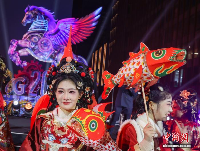 3月3日晚,江苏南京,演员们手举鱼灯在点亮的飞马彩灯前巡游。中新社记者 泱波 摄