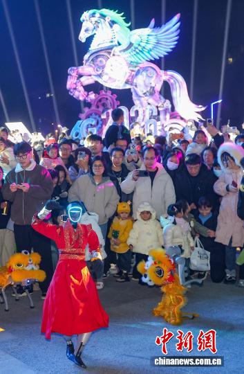 3月3日晚,江苏南京,市民在充满科技感的飞马彩灯前参与互动游戏。中新社记者 泱波 摄