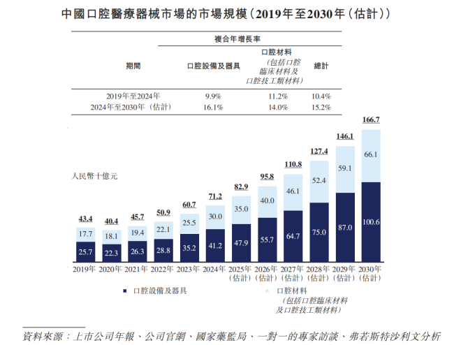中国口腔医疗器械市场规模从2019年的434亿元增至2024年的710亿元,复合年增长率达10.4%,预计2024-2030年还将以15.2%的复合年增长率增至1667亿元。其中,2024年口腔材料市场占整体口腔医疗器械市场的42.2%,但市场格局呈现高度分散的特点。