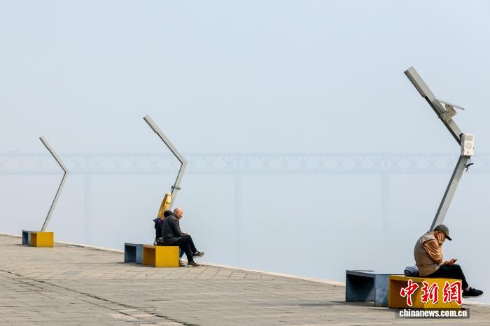 图为市民在汉阳江滩休息,远处的武汉长江大桥被雾气笼罩。中新社记者 张畅 摄